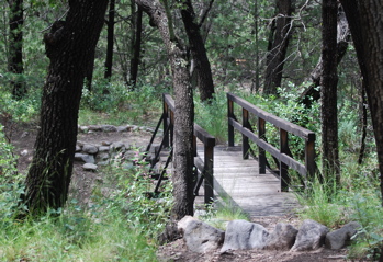 "zheek'" calls from several Mexican Jays jumping from tree to tree overhead. We walked down tree lined pathways, over wooden bridges, and through running